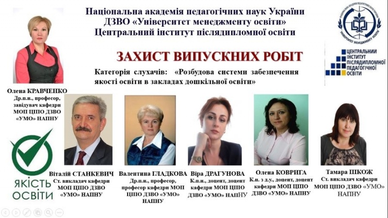 07червня 2024 рокуу Центральному інституті післядипломної освіти ДЗВО «Університет менеджменту освіти» захистом випускних робіт слухачів успішно завершено тематичні курси підвищення кваліфікації «Розбудова системи забезпечення якості освіти в закладах дошкільної освіти» (за замовленням Державної служби якості освітиУкраїни), які було розпочато з 18березня 2024 року за триетапною моделлю. Науково-організаційний супровід курсів для групи керівників та педагогічних працівників закладів дошкільної освіти усіх областей України здійснювала кафедра менеджменту освіти та права ЦІПО (завідувач Олена Кравченко, доктор педагогічних наук, професор; куратор-тьютор групи Віра Драгунова, доцент кафедри, кандидат педагогічних наук).
