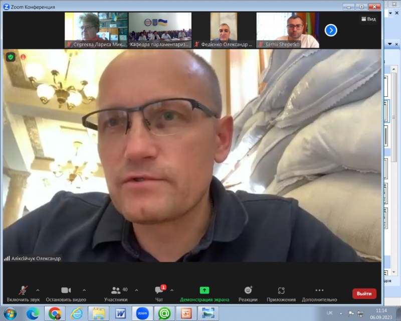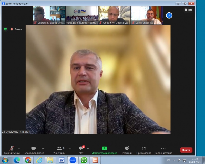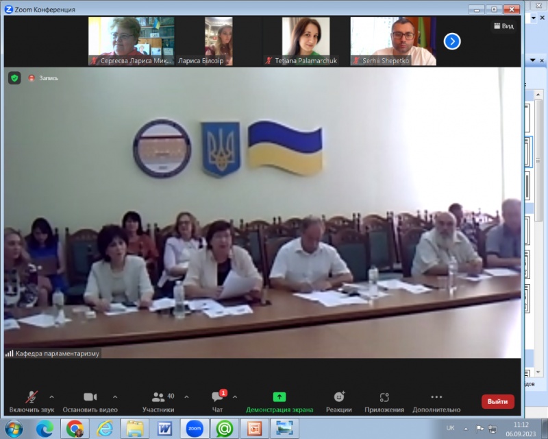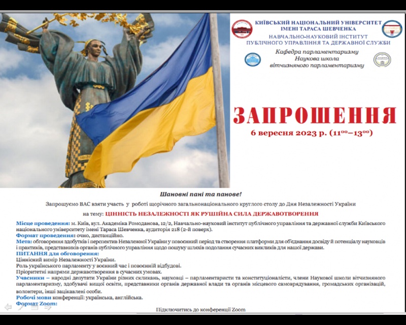 06.09.2023 р. Завідувач кафедри професійної і вищої освіти, доктор педагогічних наук, професор Лариса СЕРГЕЄВА на запрошення кафедри парламентаризму Київського університету імені Тараса Шевченка за запрошення взяти участь у роботі щорічного загальнонаціонального круглого столу до Дня Незалежності України на тему: «ЦІННІСТЬ НЕЗАЛЕЖНОСТІ ЯК РУШІЙНА СИЛА ДЕРЖАВОТВОРЕННЯ».