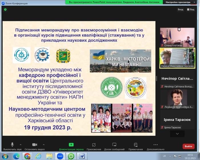 19.12.2023 р. В обстановці максимально наближеній до урочистої відбулась процедура підписання Меморандуму про взаємодію і взаєморозуміння в організації курсів підвищення кваліфікації (стажування) та прикладних наукових досліджень між кафедрою професійної і вищої освіти ЦІПО (завідувач кафедри д.пед.н., професор Лариса Сергеєва) і Науково-методичним центром ПТО у Харківській області (директор Тетяна Русланова).