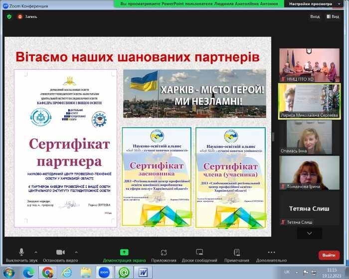 До учасників зібрання звернулись: заступник директора Науково-методичного центру професійно-технічної освіти у Харківській області Юлія Давидова, Інна Отамась, проректор з наукової роботи і цифровізації УМО, к. істор.н., доцент, Наталія Муранова, проректор з науково-педагогічної, освітньої роботи та міжнародних зв’язків УМО, д.пед.н., професор, Ніна Ткаченко, методист НМЦ ПТО, Ірина Толмачова, директор ДНЗ «Слобожанський регіональний центр професійно освіти», Вікторія Купрієвич, к.пед.н., доцент.