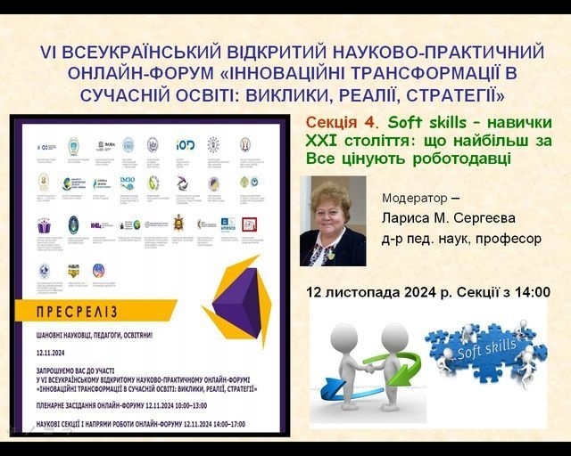 Наукова платформа 4. Soft skills — навички XXI століття: що найбільше цінують роботодавці (модератор: Лариса Сергеєва, доктор педагогічних наук, професор, завідувач кафедри професійної і вищої освіти Центрального інституту післядипломної освіти ДЗВО «Університет менеджменту освіти» НАПН України). Всього спікерів – 24.