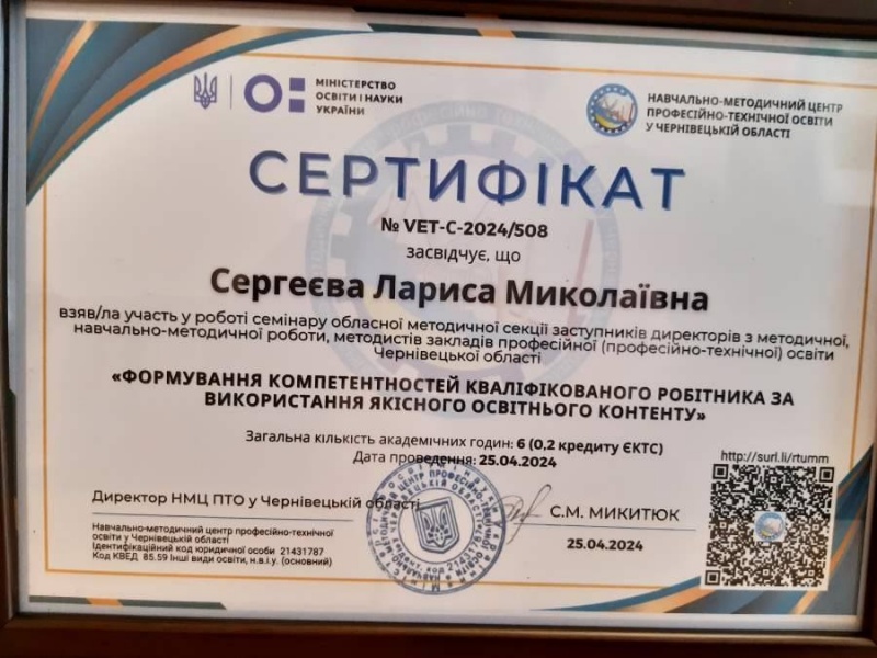 25.04.2024 р. На запрошення Навчально-методичного центру ПТО у Чернівецькій області (директор Світлана МИКИТЮК) доктор педагогічних наук, професор, завідувач кафедри професійної і вищої освіти Центрального інституту післядипломної освіти Лариса СЕРГЕЄВА взяла участь в обласному семінарі «Формування компетентностей кваліфікованого робітника за використання якісного освітнього контенту» у формі засідання обласної секції заступників директорів з методичної, навчально-методичної роботи та методистів закладів професійної (професійно-технічної) освіти області.