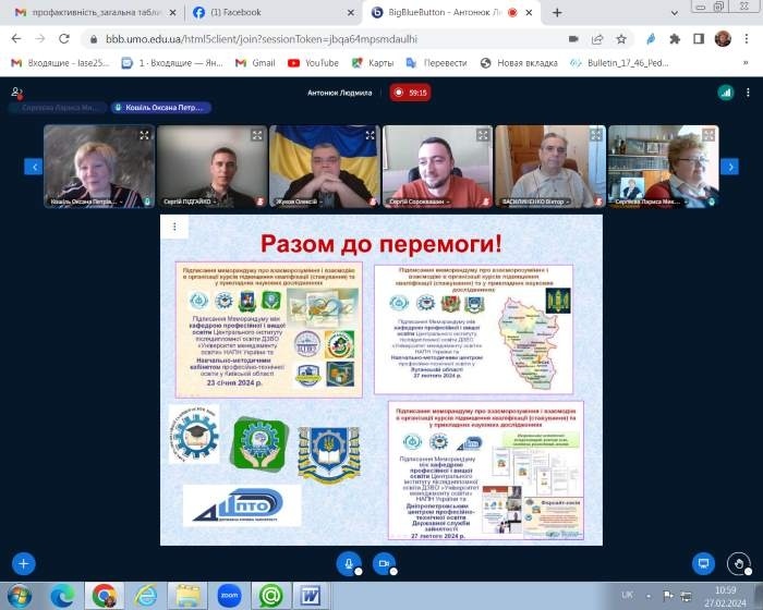 27.02.2024 р. підписано меморандуми про взаєморозуміння і взаємодію в організації курсів підвищення кваліфікації (стажування) та у прикладних наукових дослідженнях між кафедрою професійної і вищої освіти ЦІПО (завідувач доктор педагогічних наук, професор Лариса Сергеєва) Навчально-методичним кабінетом професійно-технічної освіти у Київській області (директор Марина Стасєєва), Навчально-методичним центром професійно-технічної освіти у Луганській області (директор Володимир Артюшенко) та Дніпропетровським центром професійно-технічної освіти Державної служби зайнятості (директор Лариса Сидорчук).