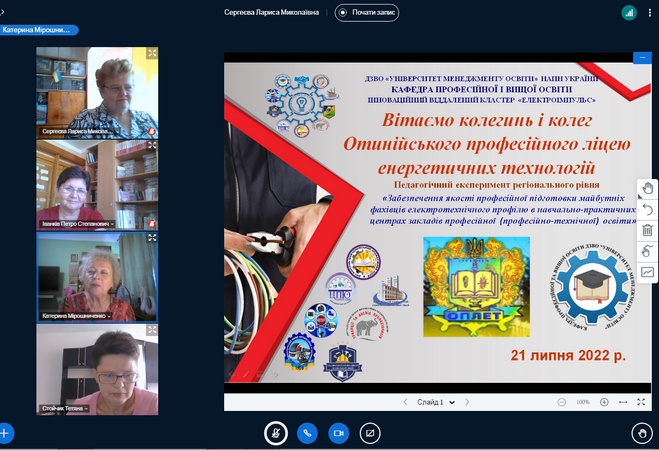 21.07.2022 р. відбувся педагогічний консіліум для учасників педагогічного експерименту Отинійського професійного ліцею енергетичних технологій (Івано-Франківська обл.) з теми: «Забезпечення якості підготовки майбутніх фахівців електротехнічного профілю в навчально-практичних центрах закладів професійної (професійно-технічної) освіти»