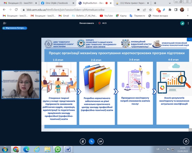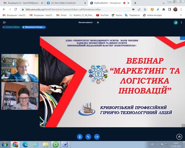 15.09.22 Проведено перший вебінар серії «Маркетинг і логістика інновацій» за результатами апробації інновацій творчої групи педагогів Криворізького професійної гірничо-технологічного ліцею Дніпропетровської області (науковий керівник ЕПМ ‒ доктор педагогічних наук, професор Лариса Сергеєва, науковий консультант ‒ академік-секретар Відділення педагогічної освіти і освіти дорослих НАПН України, дійсний член (академік) НАПН України, доктор педагогічних наук, професор Нелля Ничкало.