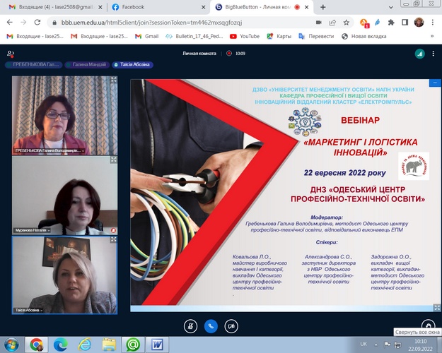 06.09.22 Відбувся навчально-організаційний Вебінар «Маркетинг і логістика інновацій у професійній освіті». (спікери: професор кафедри Марія Братко,завідувач кафедри, професор Лариса Сергеєва, доктор філософії Валерія Докторович, Катерина Мартиненко, аспірант кафедри професійної і вищої освіти ЦІПО ДЗВО «Університет менеджменту освіти» НАПН України.