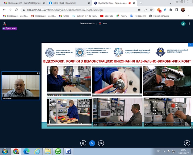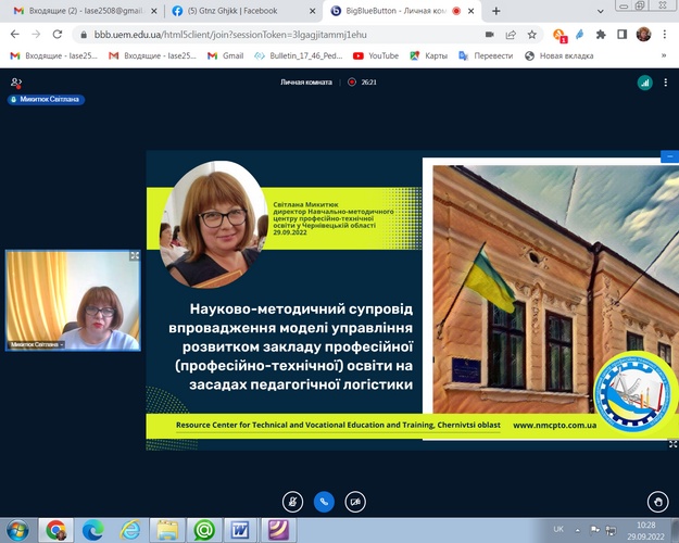 29.09.2022 р. відбувся четвертий з серії «Маркетинг і логістика інновацій» вебінар за модераторства НМЦ ПТО у Чернівецькій області та Чернівецького ВПУ радіоелектроніки. У ході вебінару розкрито важливі та науково перевірені питання теорії і методики професійної освіти: «Впровадження моделі управління розвитком ЗП(ПТ)О на засадах педагогічної логістики» - Світлана Микитюк, директор НМЦ ПТО у Чернівецькій області; «Логістика формування цифрового потоку як передумова забезпечення якості освітніх послуг» - Світлана Вишневська, методист НМЦ ПТО; «Реалізація принципів логістики в управлінні розвитком ЧВПУР» - Савелій Одайський, в.о. директора, к.п.н., «Забезпечення логістичних (сервісного та інформаційного) потоків у підготовці фахівців електротехнічного напряму (на прикладі платформи «ELECTUDE»)» - Іван Денис, керівник НПЦ електротехнічних робіт, м/в.н., викладач професійно-теоретичної підготовки; «Енергетичний фронт – забезпечення електроенергією в умовах воєнного стану (підключення сонячної панелі)» - Петро Панчук, майстер в/н, викл. професійно-теоретичних дисциплін.