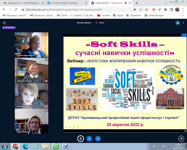 29.09.2022 р. Для слухачів КПК ЦІПО та учасників ЕПМ з теми: «Формування м’яких навичок (soft skills) майбутніх кваліфікованих робітників в освітньому середовищі закладу професійної (професійно-технічної) освіти» відбувся перший з серії "Логістика формування навичок успішності" вебінар за модеруванням ДПТНЗ "Кропивницький професійний ліцей сфери послуг і торгівлі". Розкрито теми: «Теоретичні засади логістики формування навичок активного навчання та програмування майбутніх кваліфікованих робітників в освітньому середовищі ЗП(ПТ)О» (В.С. Алєксеєвець); «Логістичні потоки формування навичок активного навчання та програмування в навчальному процесі ЗП(ПТ)О засобами проєктних технологій» (Н.М. Соколенко); «Проєктні технології як засіб формування навичок успішності (активного навчання та програмування) у виробничій діяльності здобувачів освіти ЗП(ПТ)О» (Ю.С. Гонсалес); «Учні, як суб’єкти проєктної діяльності в позанавчальній роботі ЗП(ПТ)О спрямованої на формування навичок успішності (активне навчання та програмування)» (М.О. Козаченко).