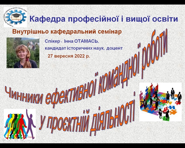 30.09.2022 р. на кафедрі професійної і вищої освіти відбувся внутрішньо кафедральний науково-практичний вебінар «Чинники ефективної командної роботи у проєктній діяльності», який провела спікер доцент кафедри І.Г. Отамась, кандидат історичних наук, доцент.