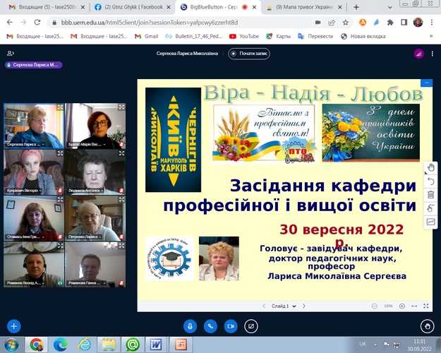 30.09.2022 р. за головування завідувача кафедри д.п.н, професора Л.М. Сергеєвої відбулось планове засідання кафедри професійної і вищої освіти. Розглянуто питання щодо організації співпраці зі стейкхолдерами для забезпечення якості освітнього процесу КПК; Про хід НДР кафедри в рамках комплексної наукової теми; Про підготовку до проведення Всеукраїнської науково-практичної онлайн конференції «Управління розвитком ЗП(ПТ)О на засадах педагогічної логістики: стан, реалії, досвід», інші поточні питання.
