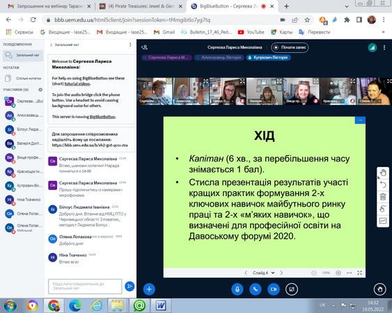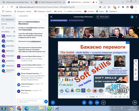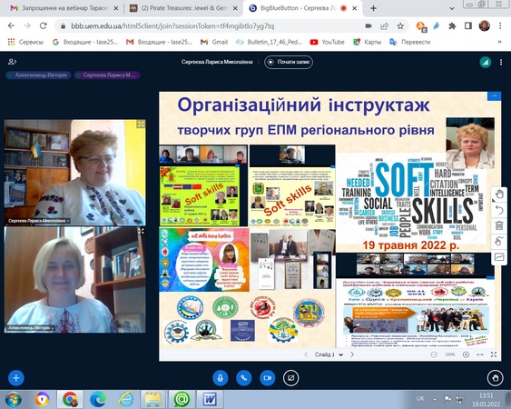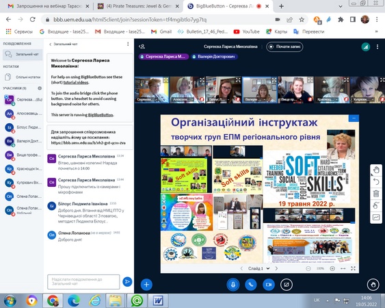 19.05.2022 р., завідувач кафедри професійної і вищої освіти д.п.н., професор Лариса Сергеєва модерувала організаційний інструктаж координаторів творчих груп ЕПМ регіонального рівня з теми «Формування м’яких навичок (soft skills) майбутніх кваліфікованих робітників в освітньому середовищі ЗП(ПТ)О».