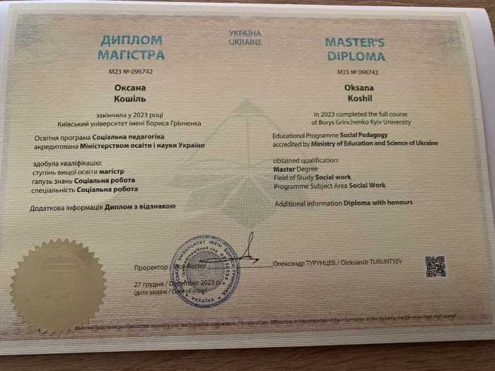 04.01.2024 р. Науково-педагогічний колектив кафедри професійної і вищої освіти вітає заступника завідувача кафедри з науково-методичної роботи, кандидата педагогічних наук, доцента кафедри Оксану Петрівну Кошіль з отриманням диплому з відзнакою освітньої програма «Соціальна педагогіка» та здобуття кваліфікації ступінь вищої освіти «магістр» галузі знань «Соціальна робота», спеціальності «Соціальна робота». Це вже другий магістерський диплом шанованої нашої колеги. Успіху, творчості, натхнення!