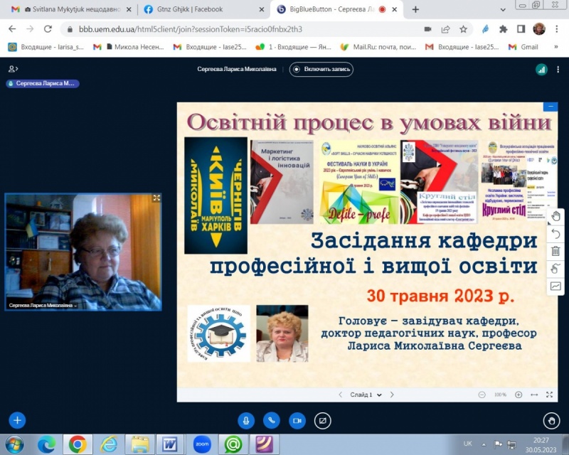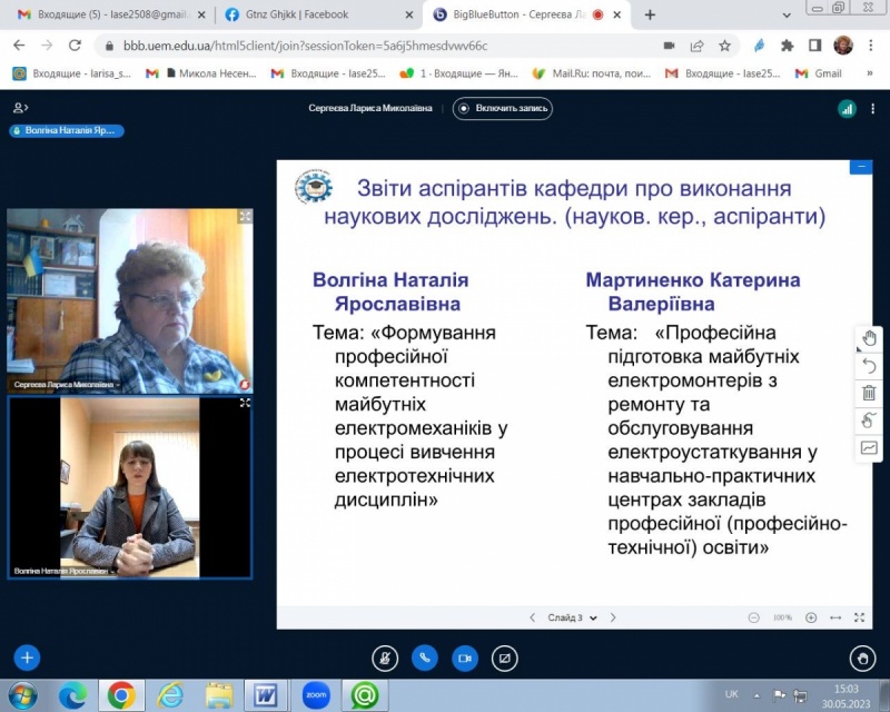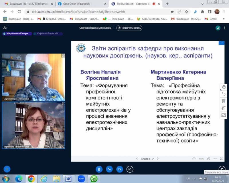 30.05.2023 р. На засіданні кафедри професійної і вищої освіти, серед інших, розглядались звіти аспірантів кафедри – Катерини Мартиненко (науковий керівник д.п.н., професор Лариса СЕРГЕЄВА) та Наталії Волгіної (науковий керівник д.п.н., професор Наталія МУРАНОВА). Аспіранти прозвітували про опанованя освітньою складовою за ІІ курс, про успішно складені всі екзамени та заліки, що передбачено навчальним планом.