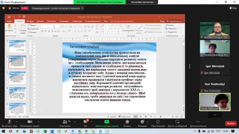 Глибоко науковим був виступ Ганни Тимошко, професора кафедри педагогіки, адміністрування і спеціальної освіти Навчально-наукового інституту менеджменту та психології ДЗВО «Університет менеджменту освіти», доктора педагогічних наук, професора, м. Київ, Україна): "Синергетичний підхід до проблеми створення управлінської команди в закладах освіти.»
