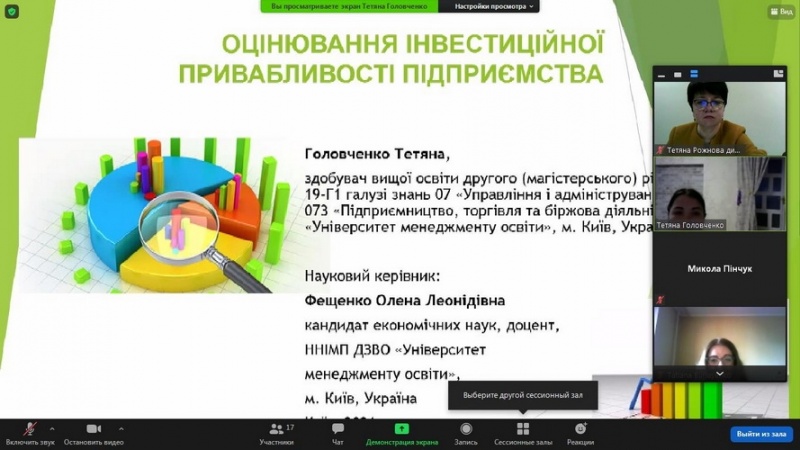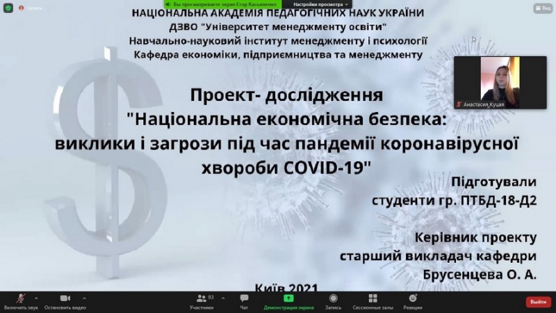 - Владислав Андруховець, Ірина Багриновська, Поліна Брацейко, Наталія Горбач, Софія Дерискиба, Станіслав Караульний, Єгор Касьяненко, Дарія Козир, Анастасія Куца, Вікторія Лукаш, Ольга Якубець, здобувачі вищої освіти спеціальності «Підприємництво, торгівля та біржова діяльність» Навчально-наукового інституту менеджменту та психології ДЗВО «Університет менеджменту освіти» з темою виступу: «Національна економічна безпека: виклики і загрози під час пандемії коронавірусної хвороби COVID-19».