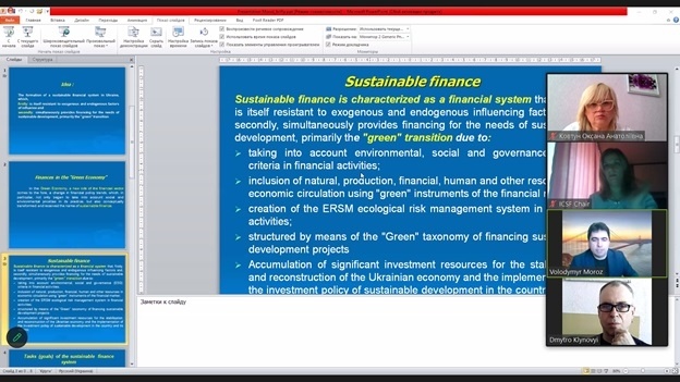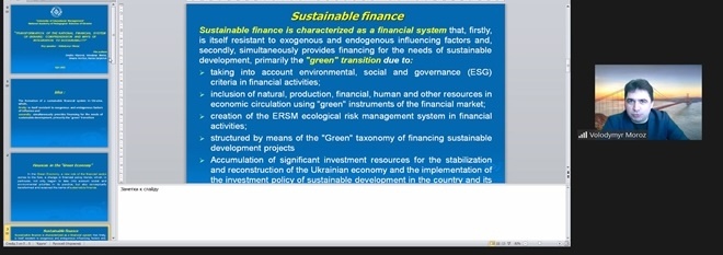Володимир Мороз виступив із співдоповіддю англійською мовою із співавторами – Ковтун Оксаною, Дмитром Клиновим (State Institution of Higher Education «University of Educational Management») та Ганною Данильчук (Bohdan Khmelnytsky Cherkasy National University) за темою: «Transformation of the national financial system of Ukraine: comprehension and ways of integration to sustainability».