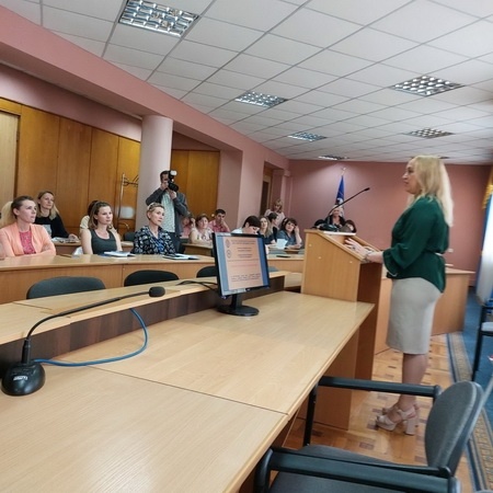 Презентацію провела Ія Дегтярьова – т.в.о. завідувача кафедри, професор кафедри публічного управління і проектного менеджменту Навчально-наукового інституту менеджменту та психології, гарант освітньо-професійної програми "Публічне управління та адміністрування". Учасники зібрання були поінформовані про освітні програми цієї та інших кафедр ННІМП, переваги навчання в УМО.
