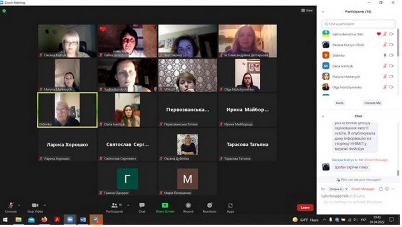 01 квітня 2022 р. науково-педагогічні працівники кафедри публічного управління і проектного менеджменту Навчально-наукового інституту менеджменту та психології ДЗВО «Університет менеджменту освіти» д.держ.упр., професорка Ія Дегтярьова, д.держ.упр., професорка Ніна Діденко, к.держ.упр., доцентка Оксана Ковтун, к.е.н., доцентка Галина Бережна, к.пед.н., доцентка Оксана Дубініна провели онлайн зустріч із здобувачами вищої освіти ОПП «Публічне управління та адміністрування» (група ДС21-Г-1) та ОП «Управління проєктами» (групи УП-20-Г1 та УП-21-Г1 (Г2).