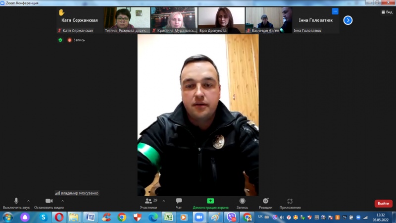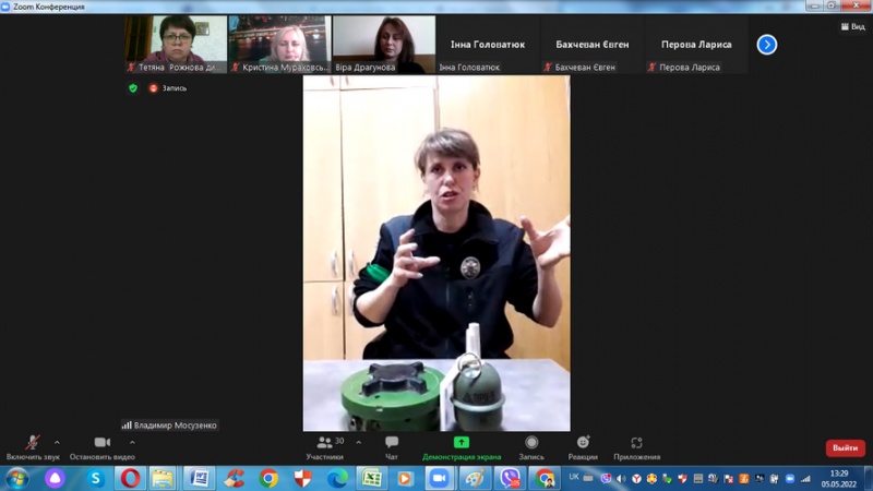 На виконання листа Міністерства освіти і науки України від 22 квітня 2022 року № 1-4408-22 «Про просвітницькі заходи з питань уникнення ураження мінами і вибухонебезпечними предметами та поведінки у надзвичайній ситуації» у Навчально-науковому інституті менеджменту та психології ДЗВО «Університет менеджменту освіти» 05 травня 2022 року відбулась онлайн-зустріч здобувачів вищої освіти та працівників інституту із колегами Одеського державного університету внутрішніх справ на тему «Уникнення враження мінами і вибухонебезпечними предметами. Поведінка здобувачів освіти у надзвичайній ситуації».