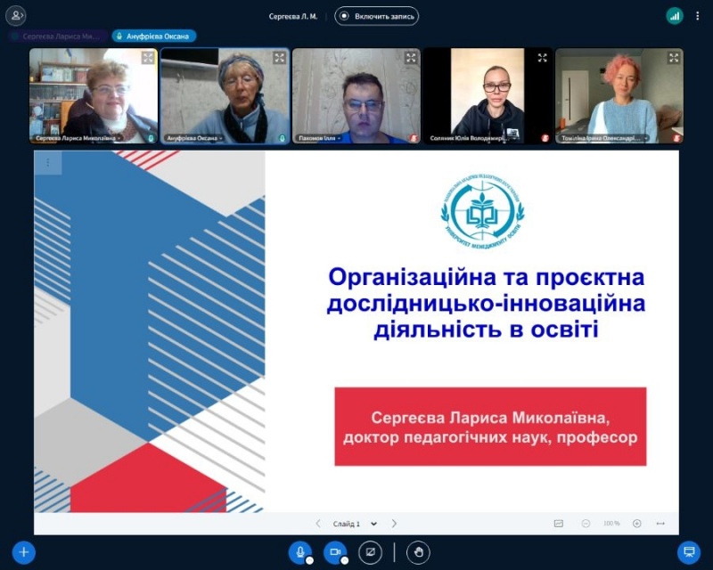Професор кафедри освіти дорослих і цифрових технологій, доктор педагогічних наук, професор Лариса Сергеєва провела заняття з теми: «Організаційна та проектна дослідницько-інноваційна діяльність в освіті», зупинилась на питаннях сутності організаційної та проєктної дослідницько-інноваційної діяльності в освіті та практика здійснення організаційної та проєктної дослідницько-інноваційної діяльності в освіті. Запросила поділимось досвідом (experience meeting) випускників аспірантури університети: в.о. директора Криворізького гірничого коледжу, доктора педагогічних наук, доцента Тетяну Стойчик, і заступника директора Сумського вищого професійного училища будівництва і дизайну, доктора філософії (PhD) Валерію Докторович, активних провайдерів проектної та дослідницько-інноваційної діяльності. Відбулась креативна розмова з досвіду роботи про стратегію розвитку сучасного закладу освіти, синергію інновацій, цифровізацію та партнерство.