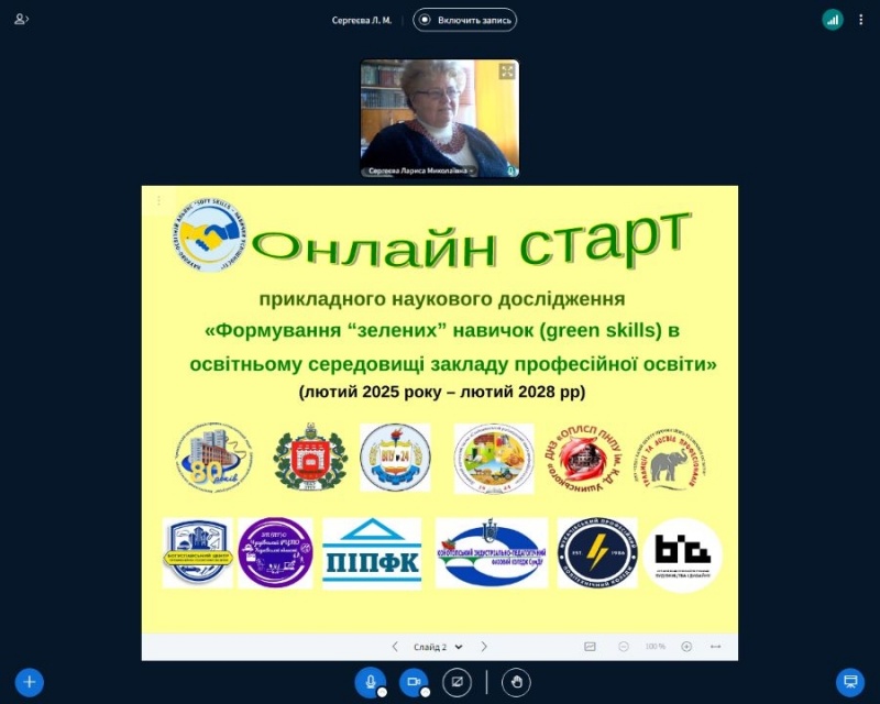 20.03.2025 р. Відбувся онлайн старт важливого інноваційного проєкту – прикладного наукового дослідження з теми: «Формування зелених навичок (green skills) здобувачів освіти в освітньому середовищі закладу освіти» (2025 – 2028 рр.) – науковий керівник доктор педагогічних наук, професор Лариса Сергеєва.