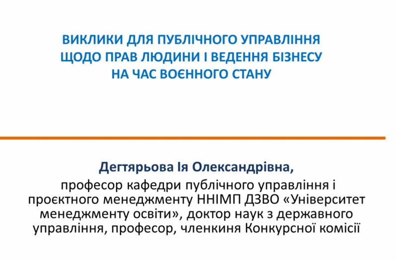 З доповіддю про виклики для публічного управління щодо прав людини і ведення бізнесу на час воєнного стану виступила Ія Дегтярьова, яка звернула увагу присутніх, що ситуація в державі має всі ознаки кризового стану і тому актуальною на сьогодні є методологія антикризового менеджменту. Серед актуальних завдань для публічної адміністрації вона виокремила:
