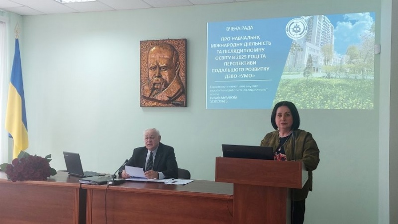 Важливим питанням порядку денного стало обговорення результатів навчальної, міжнародної діяльності та післядипломної освіти у 2025 році, а також визначення перспектив подальшого розвитку. Із доповіддю виступила проректор з навчальної, науково-педагогічної роботи та післядипломної освіти, доктор педагогічних наук, професор Наталія Муранова.