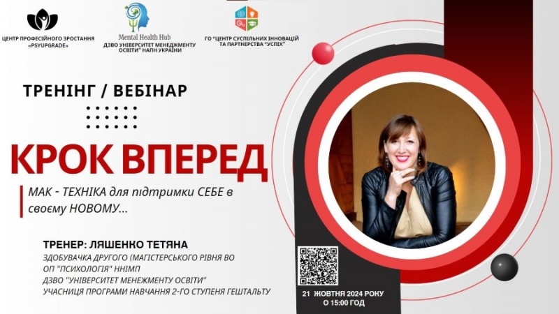 21 жовтня 2024 року тренерка Татьяна Ляшенко, здобувачка другого (магістерського) рівня вищої освіти освітньої програми «Психологія»,кафедра психології та особистісного розвитку ДЗВО «Університет менеджменту освіти» провела вебінар «Крок вперед - МАК - техніка для підтримки себе в своєму новому...».