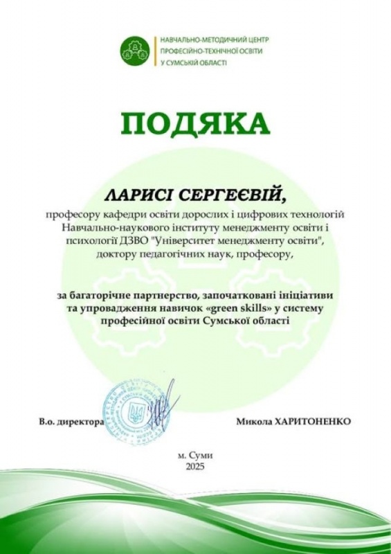 Подяки висловлено Ларисі Миколаївні Сергеєвій, професору кафедри освіти дорослих і цифрових технологій Навчально-наукового інституту менеджменту і психології, доктору педагогічних наук, професору – за багаторічне партнерство, започатковані ініціативи та упровадження навичок «greenskills» у систему професійної освіти Сумської області та від Одеського центру професійно-технічної освіти за значний особистий внесок у розвиток професійної освіти, багаторічну плідну співпрацю з популяризації вітчизняної науки та залучення педагогічних працівників закладів професійної освіти до інноваційної діяльності, активне впровадження навичок «gree skills» у систему підготовки кваліфікованих фахівців, що сприяє формуванню сучасного інноваційного та екологічно відповідального освітнього середовища.