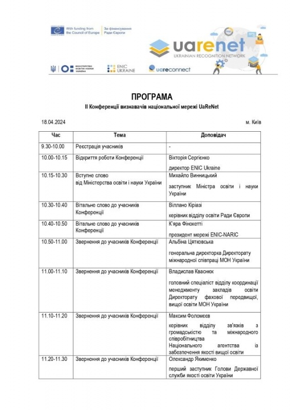 18 квітня 2024 року відбулася ІІ Конференція всеукраїнської національної мережі з визнання іноземних освітніх кваліфікацій UaReNet(UkrainianRecognitionNetwork)за фінансової підтримки Ради Європи у межах проєкту UaReConnect «Reconnecting Ukrainian Educational Area».