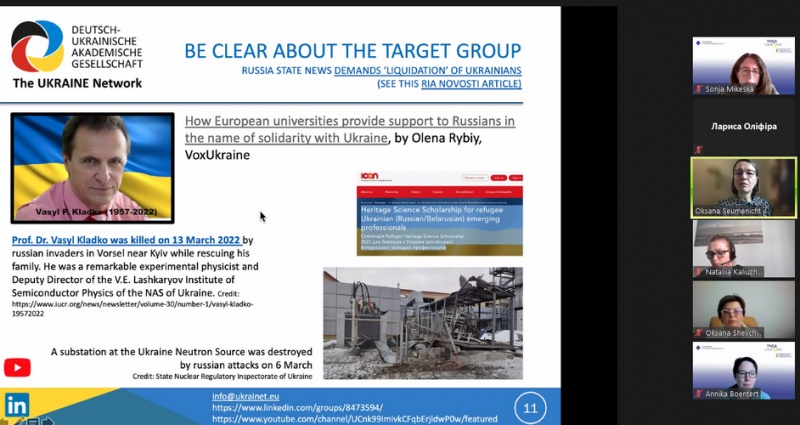 Др. Оksana Seumenicht (Німецько-українське академічне товариство) виступила із ключовою доповіддю, в якій розкрила особливості інтернаціоналізації взаємодії наукової та освітянської спільноти в умовах кризи.