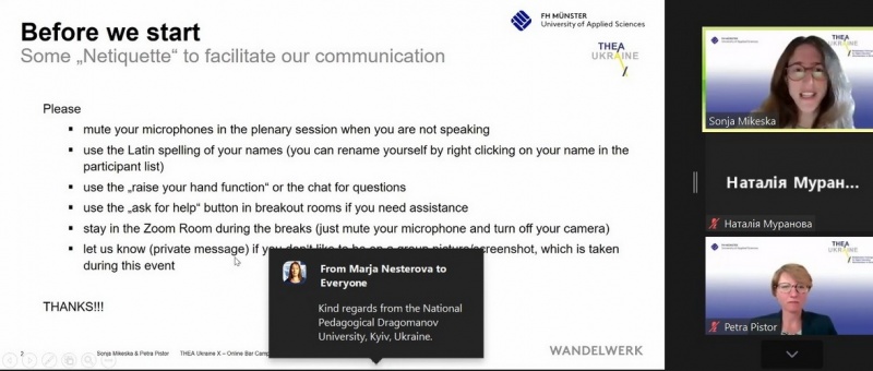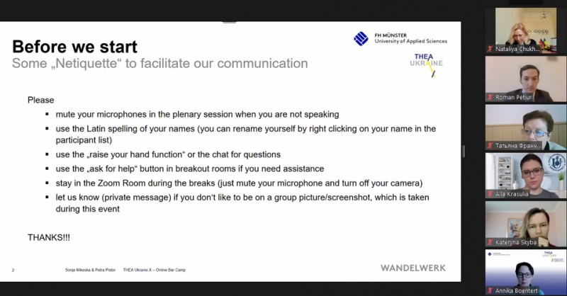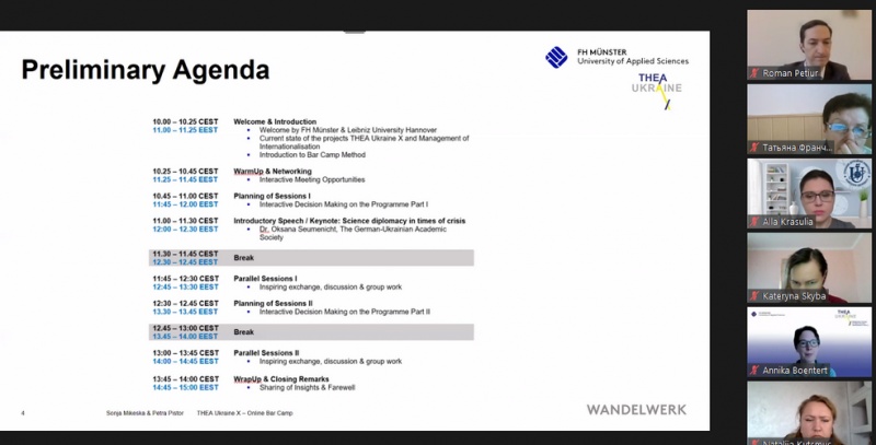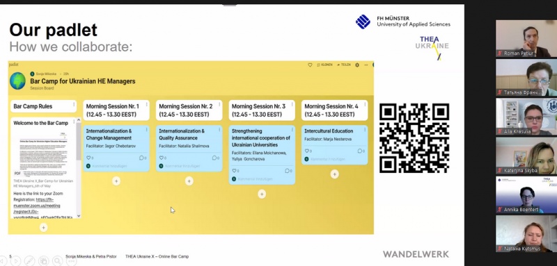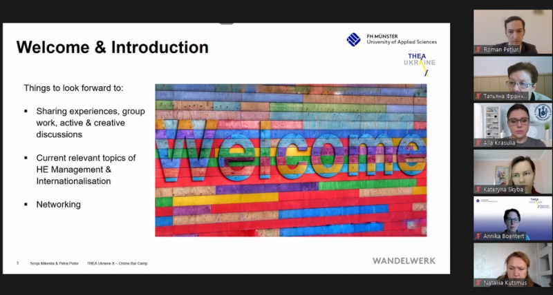 6 травня 2022 р. відбувся Online BarCamp для менеджерів вищої освіти України у межах проєкту FH Munster «THEA Ukraine X» (Multiplication Trainings for Higher Education Administrators in Ukraine), у якому взяли участь науково-педагогічні ДЗВО «Університет менеджменту освіти» НАПН України на чолі з проректоркою з науково-педагогічної, освітньої роботи та міжнародних зв’язків Наталією Мурановою та директоркою Центрального інституту післядипломної освіти Тамарою Сорочан.
