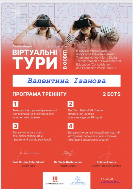 Професор кафедри економіки, підприємництва та менеджменту ДЗВО «Університет менеджменту освіти» Валентина Іванова, доктор економічних наук, успішно пройшла тренінг «Віртуальні тури в освіті», що відбувався з 11 по 20 листопада 2025 року.
