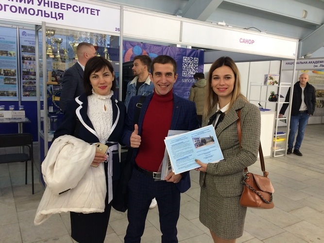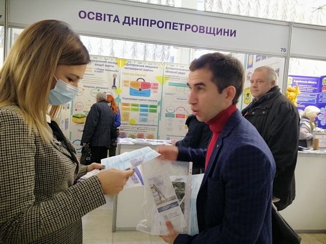 Освітній майданчик виставки є вдалою платформою для проведення профорієнтаційної роботи з майбутніми вступниками. Так працівники Консультаційного центру приймальної комісії університету директор Святослав Корсакевич та методист Ольга Задніпрянець провели неформальні бесіди з відвідувачами – батьками, учнями старших класів, здобувачами освіти тощо. У ході розмови презентувалася діяльність закладу освіти, напрями підготовки фахівців, роз’яснювалися Умови вступу до університету, а також роздавалася рекламна продукція.