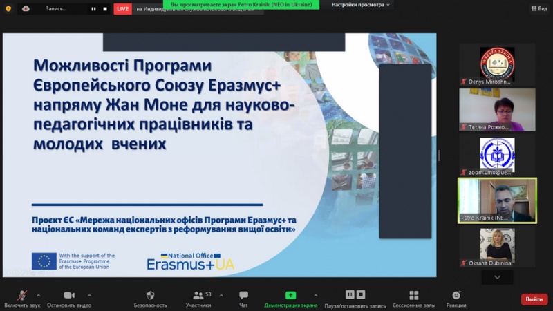 Під час роботи круглого столу було висвітлено питання експертом напряму Жан Моне та з реєстрації проєктів міжнародної технічної допомоги Національного Еразмус+ офісу в Україні Петром Крайніком «Можливості програми Європейського Союзу Еразмус+ напряму Жан Моне для науково-педагогічних працівників та молодих вчених».
