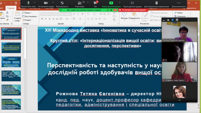 І завершила роботу круглого столу директорка ННІМП ДЗВО «УМО», Тетяна Рожнова, кандидатка педагогічних наук, доцентка, яка була і модератором заходу, підвивши підсумки роботи круглого столу та презентувавши присутнім «Перспективність та наступність у науково-дослідній роботі здобувачів вищої освіти в ННІМП», акцентуючи увагу саме на важливості інтернаціоналізації вищої освіти.