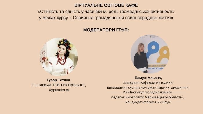 ПРОВЕДЕНО ВІРТУАЛЬНЕ СВІТОВЕ КАФЕ «СТІЙКІСТЬ ТА ЄДНІСТЬ У ЧАСИ ВІЙНИ: РОЛЬ ГРОМАДЯНСЬКОЇ АКТИВНОСТІ» У МЕЖАХ КУРСУ «СПРИЯННЯ ГРОМАДЯНСЬКІЙ ОСВІТІ ВПРОДОВЖ ЖИТТЯ»