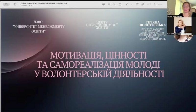Так, у межах програми підвищення кваліфікації категорії слухачів: «Волонтерство та студентське самоврядування у формуванні громадянських компетентностей здобувачів освіти» (куратор-тьютор ‒ кандидат політичних наук, доцент Андрій Єрмоленко) сучасними підходами до розвитку молодіжного волонтерського руху, особливостями формування мотивації та ціннісних орієнтацій молоді, під час лекційних і практичних занять, поділилася кандидат педагогічних наук, доцент кафедри педагогіки, адміністрування і спеціальної освіти Тетяна Волотовська.