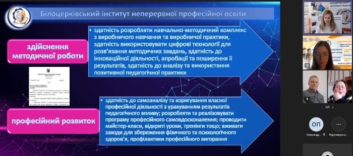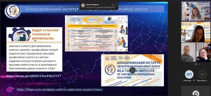 28 лютого 2024 року у Білоцерківському інституті неперервної професійної освіти ДЗВО «Університет менеджменту освіти» НАПН України відбулась онлайн-зустріч Консалтингового центру БІНПО «Новітні педагогічні й виробничі технології» з педагогами професійно-технічної освіти Чернігівської та Житомирської областей.