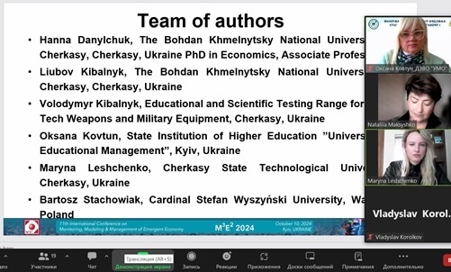 Оксана КОВТУН також взяла участь у роботі секції 2 із співдоповіддю із представниками The Bohdan Khmelnytsky Cherkasy National University, Educational and Scientific Testing Range for High-Tech Weapons and Military Equipment, Cherkasy State Technological University, Cardinal Stefan Wyszyński University (Poland) за темою: «Analysis and Modeling of Macroeconomic Indicators of National Economies in the Context of the Russian-Ukrainian War».
