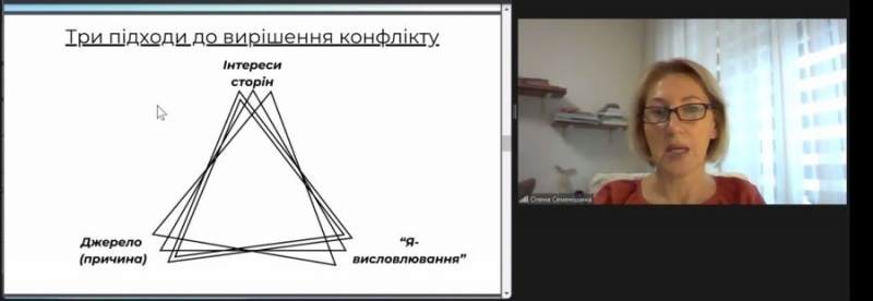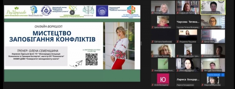 21 листопада 2024 року в Україні, у день відзначення Дня Гідності та Свободи відбувся онлайн-воркшоп з Семенішиною Оленою, керівником Одеської філії ГО «Міжнародна Асоціація Психологів та Тренерів Експертів», членом «Української асоціації екологічної психологічної допомоги», ГО «Прогресильні», викладачем і, водночас, здобувачем освітньої програми «Психологія» кафедри психології та особистісного розвитку ДЗВО «Університет менеджменту освіти» на тему: «Мистецтво запобігання конфліктів».