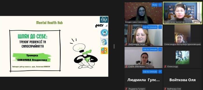 01 грудня 2023 у рамках діяльності Психологічного Хабу «Mental Health Hub» відбувся тренінг «Шлях до Себе: Тренінг Рефлексії та Самосприйняття», який провела здобувачка першого (бакалаврського) рівня вищої освіти (IV курс) спеціальності «Психологія» ННІМП ДЗВО «Університет менеджменту освіти» НАПН України Владислава Соколова під керівництвом викладача кафедри психології та особистісного розвитку, доктора психологічних наук, професора Валентини Балахтар.