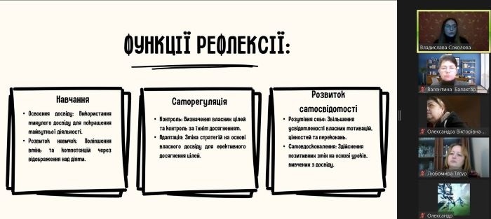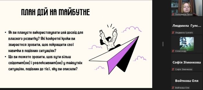 Учасники тренінгу мали змогу не лише поглибити знання щодо сутності, форм і видів рефлексії, але попрактикувати, порефлексувати через моделювання вирішення власних проблемних ситуацій, усвідомити власні сильні сторони, опанувати навички планування дій на майбутнє,