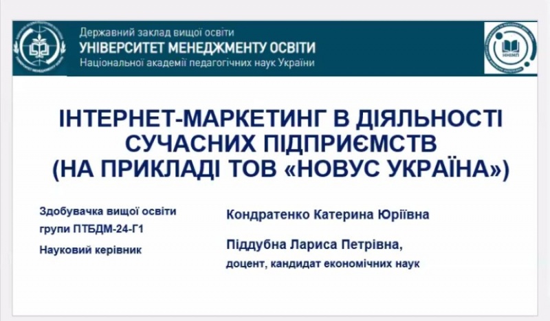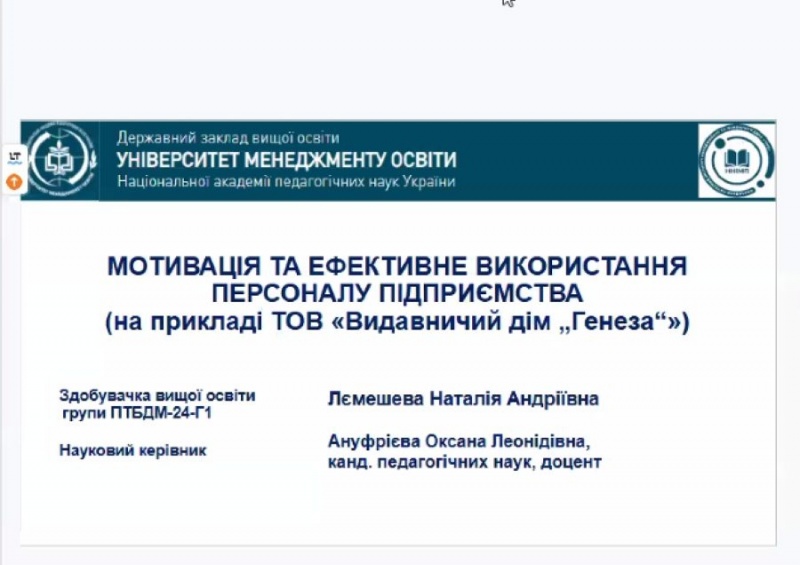 27 квітня 2026 року на кафедрі економіки та менеджменту ДЗВО «Університет менеджменту освіти» відбувся захист випускних кваліфікаційних робіт здобувачів другого (магістерського) рівня вищої освіти заочної форми навчання. У заході взяли участь здобувачі групи МОБМ-24-Г1 освітньо-професійної програми «Менеджмент організацій та адміністрування (за видами економічної діяльності)» спеціальності 073 Менеджмент та групи ПТБДМ-24-Г1 освітньо-професійної програми «Підприємництво, торгівля та біржова діяльність» спеціальності 076 Підприємництво та торгівля.