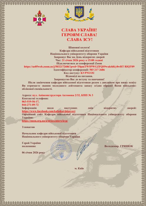 Запрошення на День відкритих дверей 21 січня 2026 року на Кафедру військової підготовки Національного університету оборони України