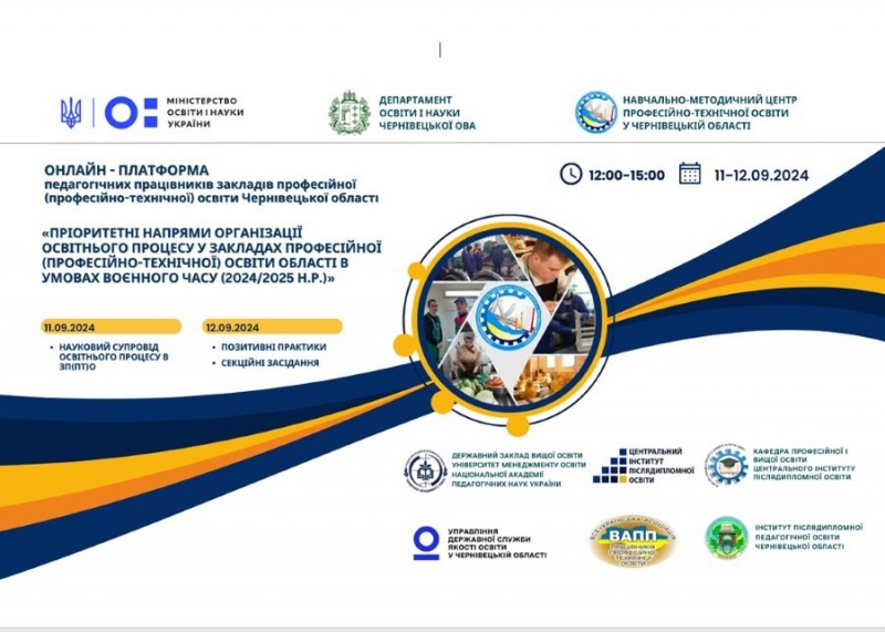 Ольга Просіна, кандидат педедагогічних наук, доцент, завідувач кафедри взяла активну участь у роботі онлайн-платформи для педагогічних працівників закладів професійної (професійно-технічної) освіти Чернівецької області, що відбувається 11-12 вересня 2024 року. Захід, організований Міністерством освіти і науки України спільно з Департаментом освіти і науки Чернівецької ОВА та Навчально-методичним центром професійно-технічної освіти, мав на меті обговорення пріоритетних напрямів організації освітнього процесу в умовах воєнного часу.