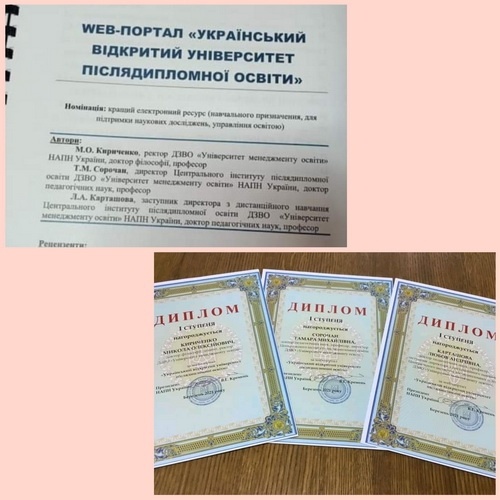 - У номінації «За кращий електронний ресурс (навчального призначення, для підтримки наукових досліджень, управління освітою)» дипломом І ступеня за web-портал «Український відкритий університет післядипломної освіти» відзначено ректора Кириченка Миколу Олексійовича, професора кафедри філософії і освіти дорослих; директора ЦІПО Сорочан Тамару Михайлівну, професора кафедри філософії і освіти дорослих; заступника директора з дистанційного навчання ЦІПО Карташову Любов Андріївну.