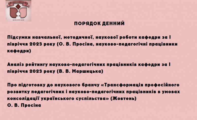 - Підсумки навчальної, методичної, наукової роботи кафедри за І півріччя 2023 року (О. В. Просіна, науково-педагогічні працівники кафедри).