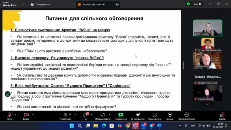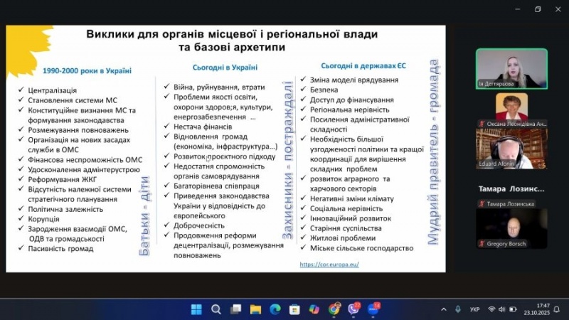 23 жовтня 2025 р. аспіранти взяли участь у гостьовій лекції за спеціальністю D4 Публічне управління та адміністрування на освітньому онлайн-майданчику НТ УША, УМО НАПН України і ДІМЗ ьіз серії публічних виступів представників Української школи архетипіки в контексті популяризації результатів досліджень «Майбутнє врядування в Україні: від архетипу “Воїна” до архетипу “Мудрого Правителя” та “Садівника” на місцевому рівні».