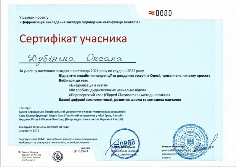 Учасниця проєкту – Дубініна Оксана Володимирівна, кандидатка педагогічних наук, доцентка, професорка кафедри публічного управління і проєктного менеджменту